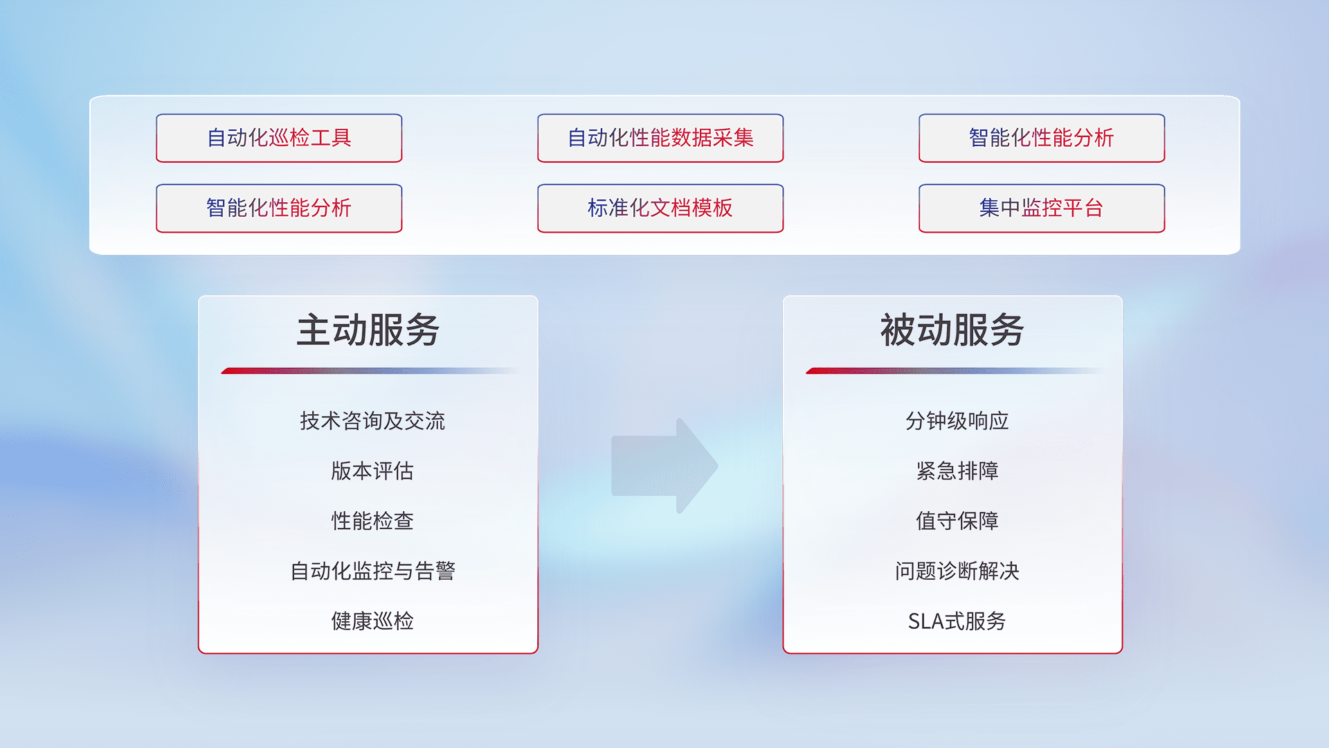 智能化工具和标准化文档,,保障服务质量,,,,提供主动服务(包含技术咨询、、、、版本评估、、、性能检查、、、、自动化监控与告警、、健康巡检)和被动服务包含(分钟级响应、、、、紧急排障、、、值守保障、、、问题诊断解决、、、SLA服务)。。